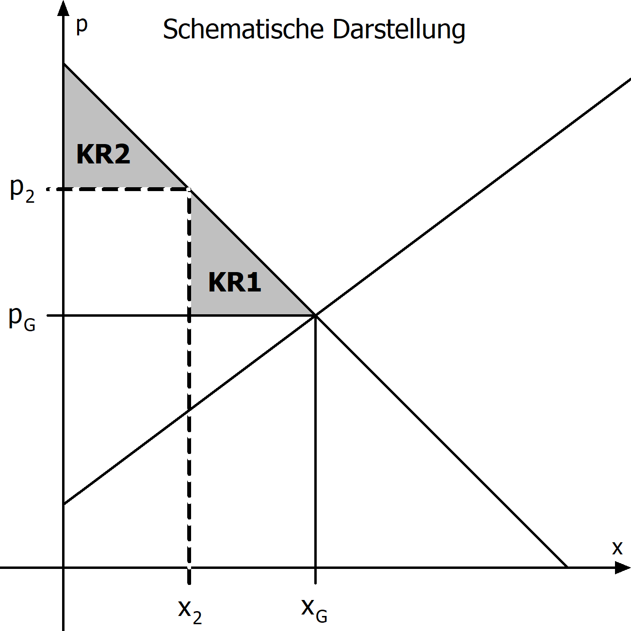 Wir beobachten: Die Konsumentenrente wird minimal, falls der Inhalt des weißen Quadrats mit den Kantenlängen $x_2$ und $p_2-p_G$ maximal wird.