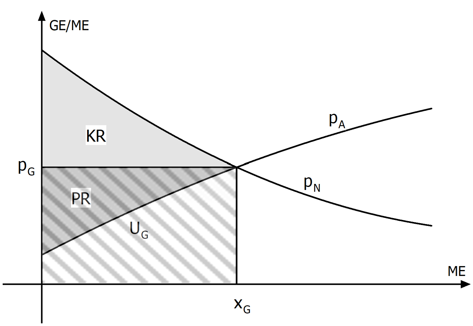 Definition: Die Produzentenrente $PR$ ist die Differenz aus dem Umsatz im Marktgleichgewicht und der Angebotssbereitschaft des Markts.