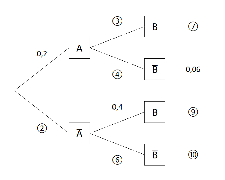 Die Wahrscheinlichkeit 4 wird mit $x$ bezeichnet und kann wie folgt berechnet werden $0{,}2\cdot x = 0{,}06$ $\Rightarrow$ $x=0{,}3$. Dann kann sukzessive das Baumdiagramm vervollständigt werden.