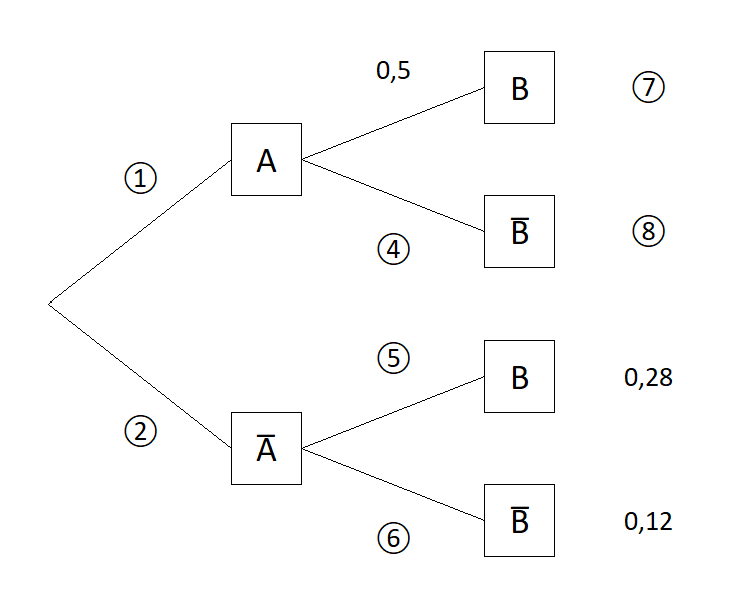 - Auf der zweiten Stufe stehen die Wahrscheinlichkeiten von $B$ und $\overline{B}$ in Abhängigkeit davon, ob $A$ eingetreten ist oder nicht (diese Wahrscheinlichkeiten sind im Allgemeinen nicht $P(B)$ und $P(\overline{B})$).